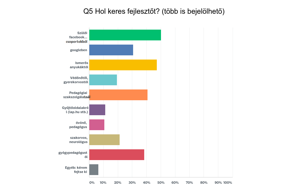 A Fejlesztokorok.hu fejlesztéskereső oldal kutatása* megvizsgálta, hogy hol keresnek fejlesztőt és információt a szülők, milyen szempontok szerint választanak terapeutát. A kutatás első része kimondottan a gyógypedagógusok/fejlesztők számára érdekes. A legfontosabb észrevételek, hogy a szülők 89%-a válaszolta azt, hogy az állami fejlesztésen kívül igénybe vesz magán fejlesztéseket is, a szülő-barát bánásmód a 3. legfontosabb szempont a terapeuta kiválasztásánál, és a szülők 86,5%-a váltott már fejlesztést/fejlesztőt.