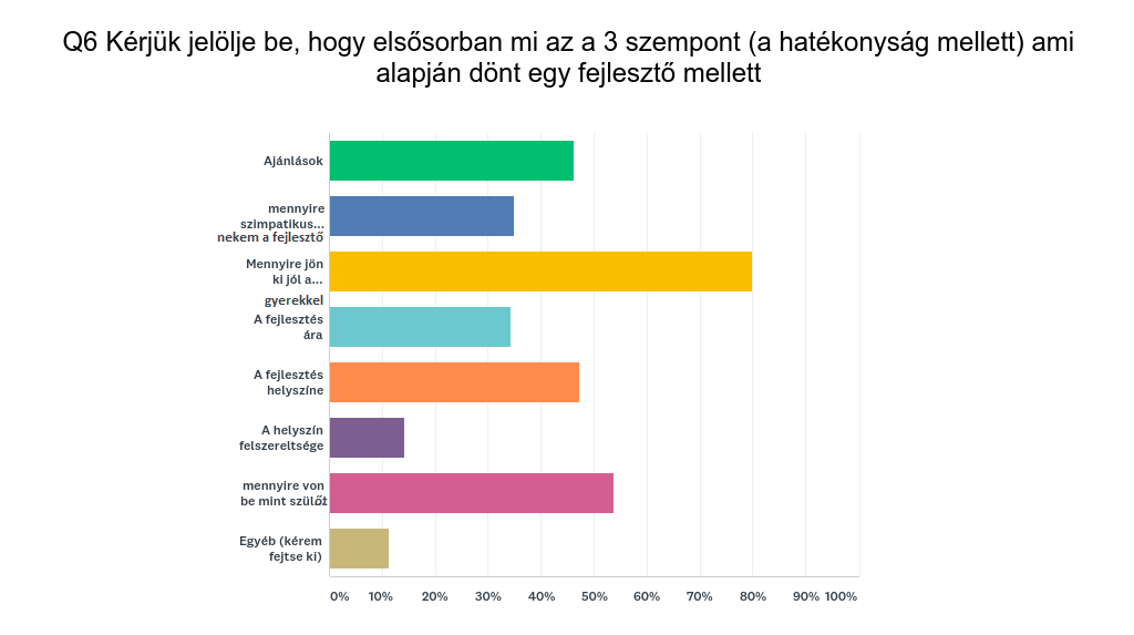 Erre a kérdésre a válaszok minden csoportban (kevesebb mint egy éve fejlesztők, több mint négy éve fejlesztők, autizmussal élő családok vidék-Budapest) nagyjából azonosak voltak. Ezek alapján kijelenthetjük, hgoy a hatékonyság mellett a 4 legfontosabb szempont: