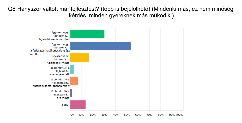 A válaszadók 86,5%-a váltott már fejlesztést/fejlesztőt, leggyakrabban a hatékonyság miatt (54%), és 33% a fejlesztő személye miatt keresett másik terapeutát (pl nem volt jó az összhang a gyerekkel, vagy szülővel, nem passzoltak a személyiségek).